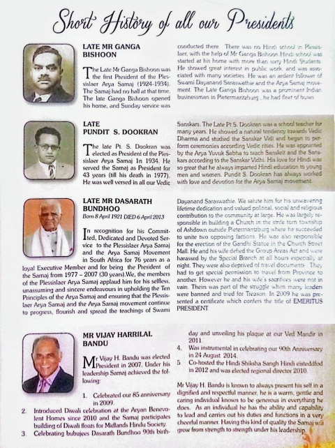 “This history of the Plessislaer Arya Samaj is dedicated to the gallant, men and women who, inspired by the teachings of Swami Dayanand Saraswati, were its foundation members. Today despite many obstacles, the Samaj stands as a beacon of light in our South African setting.